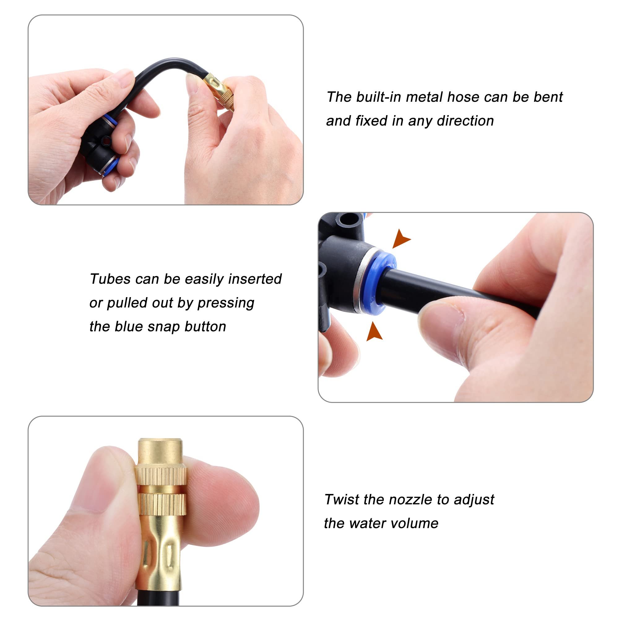 Adjustable nozzles: Help you save water when watering plants and flowers; Meet the strict requirements of greenhouse seedlings and flower crops for water mist; 360° rotatable flexible misting line, The extender can be bent to make any angle as you like
